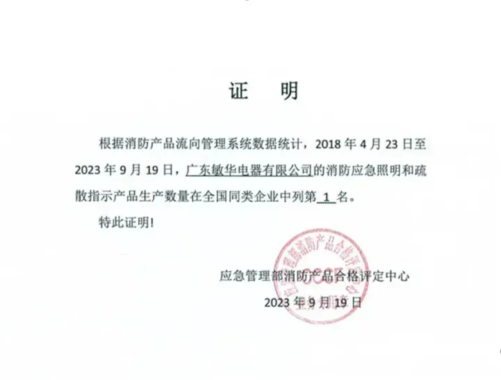 多年来,敏华凭借其稳健的经营策略、持续的创新精神以及卓越的产品品质,在业界赢得了良好的口碑。根据应急管理部消防产品合格评定中心数据统计,敏华在2018年至2023年消防应急照明和疏散指示产品生产数量在全国同类企业中列第1名,充分印证敏华在消防应急领域的品牌影响力和企业实力。