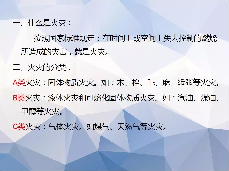 什么是火灾:按照国家标准规定:在时间上或空间上失去控制的燃烧所造成的灾害,就是火灾。