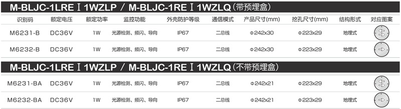 【材质】拉丝不锈钢面盖 【防护等级】IP67 【安装方式】地埋式 【额定电压】DC36V 【主电功耗】1W 【LED光源】高亮、低功耗LED 【外形尺寸(直径×厚)】Ф242*30mm 【预埋盒尺寸】Ф223*30mm 【包装数量】10台 | 【材质】拉丝不锈钢面盖 【防护等级】IP67 【安装方式】地埋式 【额定电压】DC36V 【主电功耗】1W 【LED光源】高亮、低功耗LED 【外形尺寸(直径×厚)】Ф242*30mm 【预埋盒尺寸】Ф223*30mm 【包装数量】10台 | 【材质】拉丝不锈钢面盖 【防护等级】IP67 【安装方式】地埋式 【额定电压】DC36V 【主电功耗】1W 【LED光源】高亮、低功耗LED 【外形尺寸(直径×厚)】Ф242*21mm 【预埋盒尺寸】Ф223*29mm 【包装数量】20台 | 【材质】拉丝不锈钢面盖 【防护等级】IP67 【安装方式】地埋式 【额定电压】DC36V 【主电功耗】1W 【LED光源】高亮、低功耗LED 【外形尺寸(直径×厚)】Ф242*21mm 【预埋盒尺寸】Ф223*29mm 【包装数量】20台 |
