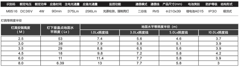 | 21 | M6516 | M6516(M-ZLZC-E4W6516)自电集控200mm塑料吸顶灯/不带感应 | 【材质】防火塑料 【防护等级】IP30 【安装方式】吸顶式 【额定电压】DC36V 【主电功耗】4W 【LED光源】高亮、低功耗LED 【主电光通量】≥350Lm 【应急光通量】≥300Lm 【色温】6500K 【应急时间】≥90分钟 【电池】3.7V2000mAh锂电池 【外形尺寸(直径×高)】Ф210*39mm 【包装数量】20台 | ![]() |