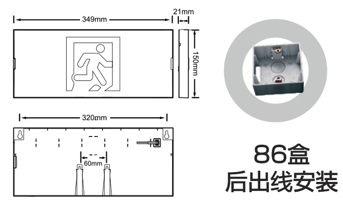 | 131 | M6786-B | M6786-B(M-BLZC-1LROEⅠ0.5WZPV)自电集控二代349mm单面全塑料标志灯/R1图/拉丝铝面板 | 【材质】防火塑料+拉丝铝面 【防护等级】IP30 【安装方式】挂墙式/86盒安装 【额定电压】DC36V 【主电功耗】0.5W 【LED光源】高亮、低功耗LED 【应急时间】≥90分钟 【电池】1.2V300mAh镍氢电池 【外形尺寸(长×宽×厚)】349*150*19.8mm 【孔距尺寸】317/60mm 【包装数量】40台 | ![]() |