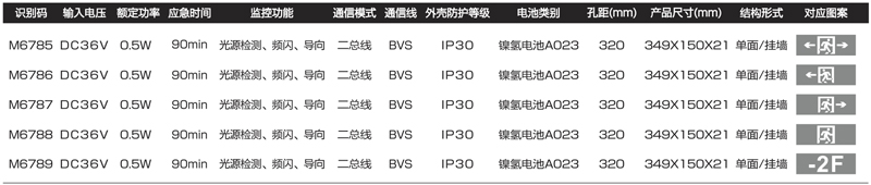 | 138 | M6789-C | M6789-C(M-BLZC-1LROEⅠ0.5WZPV)自电集控二代349mm单面全塑料标志灯/8F图通用楼层/拉丝铝面板 | 【材质】防火塑料+拉丝铝面 【防护等级】IP30 【安装方式】挂墙式/86盒安装 【额定电压】DC36V 【主电功耗】0.5W 【LED光源】高亮、低功耗LED 【应急时间】≥90分钟 【电池】1.2V300mAh镍氢电池 【外形尺寸(长×宽×厚)】349*150*19.8mm 【孔距尺寸】317/60mm 【包装数量】40台 | ![]() |