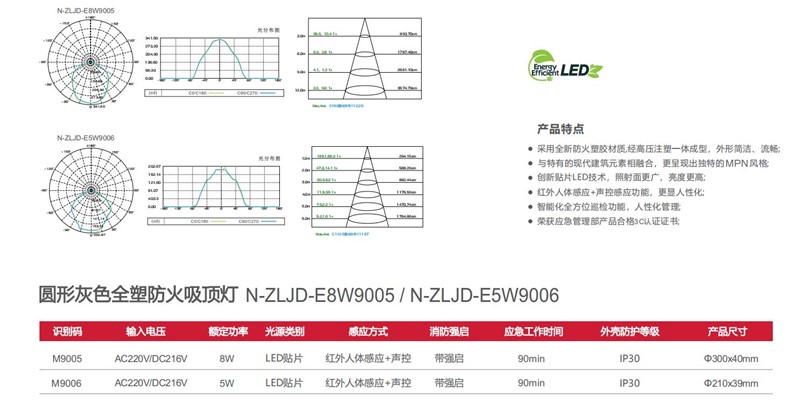 | 9 | M9005 | M9005(N-ZLJD-E8W9005)集中电源型300mm塑料吸顶灯/灰色壳/人体感应/声控感应/强启 | 【材质】防火塑料 【防护等级】IP30 【安装方式】吸顶式 【额定电压】AC220/DC216V 【主电功耗】8W 【LED光源】高亮、低功耗LED 【光通量】≥540Lm 【应急方式】人体感应+声控感应/强启 【外形尺寸(直径x高)】Ф300*40mm 【包装数量】20台 | ![]() |