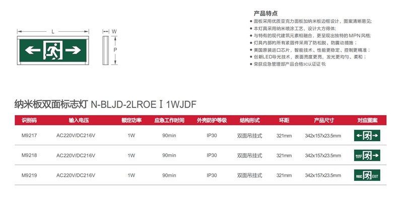 | 30 | M9219 | M9219(N-BLJD-2LROEⅠ1WJDF)集中电源型双面二代彩钢板边框迷你标志灯/浅墨绿底R4图 | 【材质】纳米板+玻璃面板 【防护等级】IP30 【安装方式】吊挂式 【额定电压】AC220V/DC216V 【主电功耗】1W 【LED光源】高亮、低功耗LED 【外形尺寸(长×宽×厚)342*150*23mm 【孔距尺寸】321mm 【包装数量】20台 | ![]() |